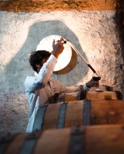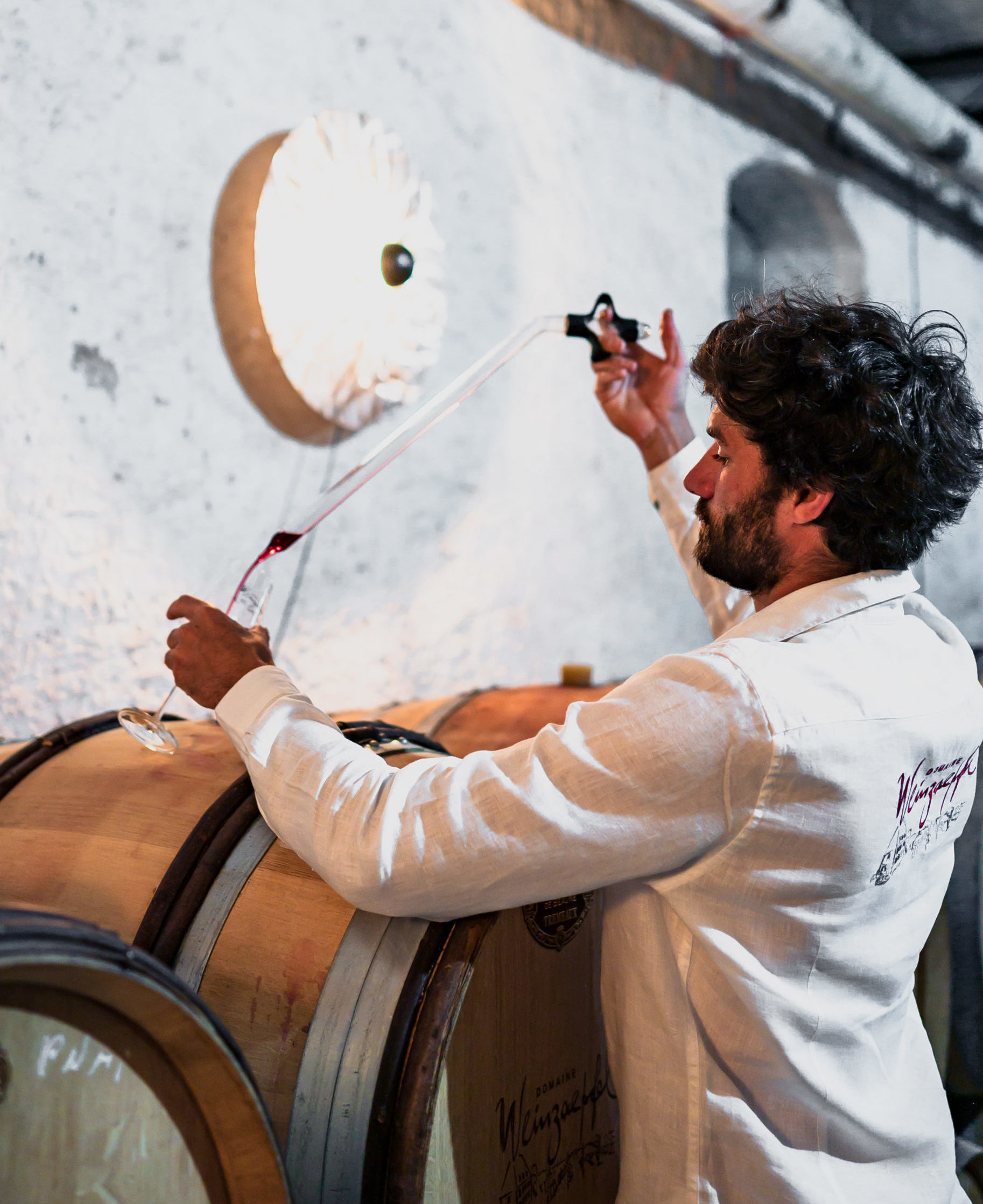 La sonorité bullante des cuves inox enchante les lieux. La régulation des températures permet de gérer l’activité levurienne pour limiter les déviances. En ce sens, les cuves inox favorisent également le nettoyage et l’élaboration sans soufre. Une fois la fermentation terminée les vins sont sulfités, élevées de longs mois. Certains vins sont alors soutirés pour se peaufiner en barriques de chêne français. Les murs de l’ancien couvent permettent de garder la fraicheur naturelle propice à l’élevage. Les vins restent sur lies jusqu’aux derniers jours avant la mise en bouteille, afin de les protéger et d’affiner les dernières notes subtiles. L’ensemble des opérations sont dictées par le calendrier lunaire en fonction du type de vin recherché.